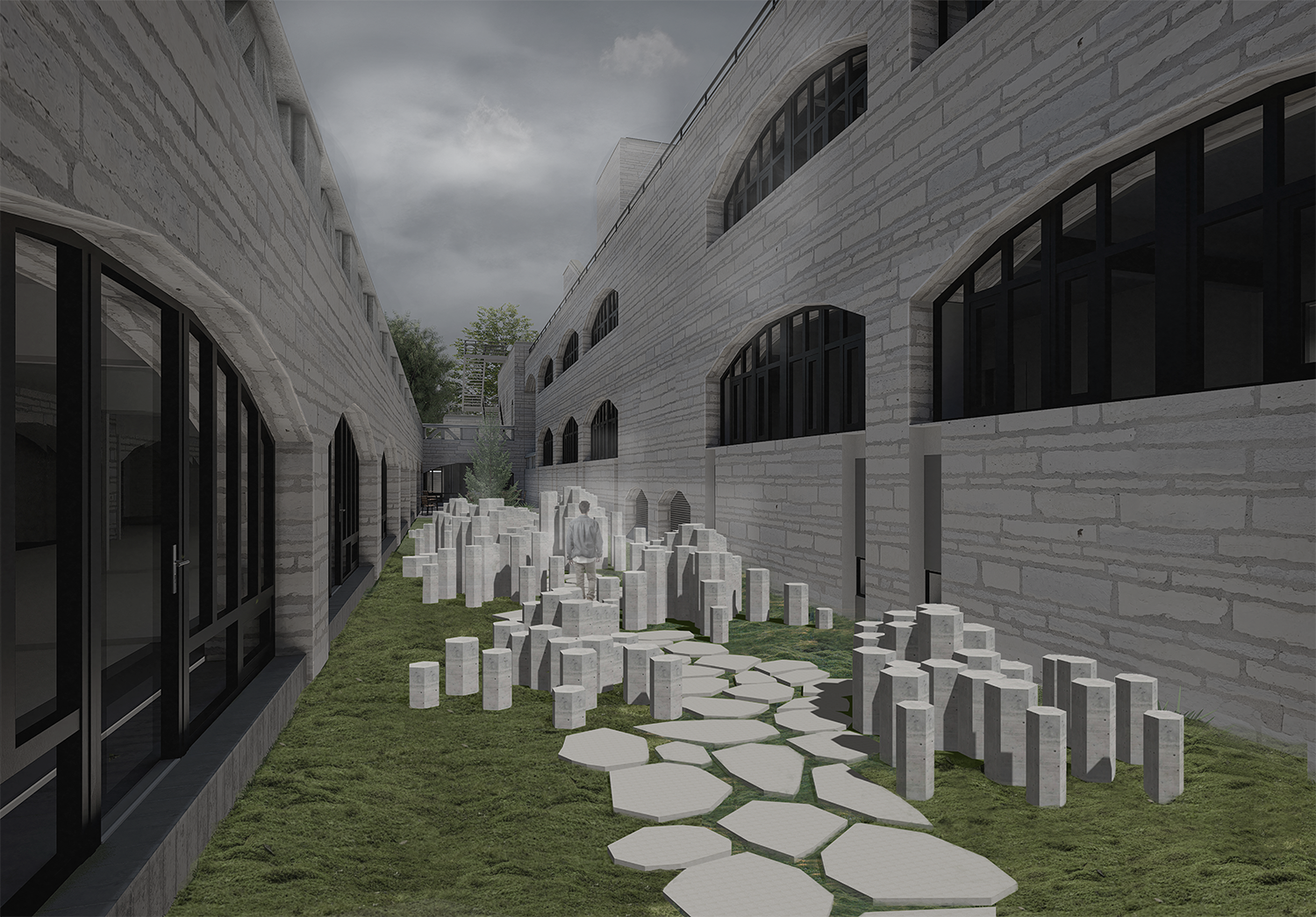 The proposal for the National Library’s (RaRa) outdoor artwork competition saw a spatially unfolding landscape work between two outdoor seating areas, which functions on the one hand as a meditative moss garden and at the same time as a mini-landscape that relates to the materiality of the building, inviting library visitors on a calming journey and at the same time spatially connecting the two outdoor seating areas.